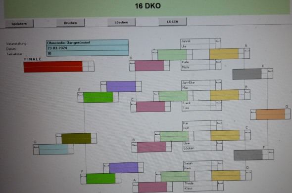 Max hat das entsprechende Turnierprogramm für die 16 Teilnehmer am Rechner angelegt. Michael hat die Moderation, Grillaushilfe usw übernommen. Hartmut, Antje und Kalle sorgten für die Getränke und das Catering. Nach der Anmoderation und Einweisung von Michael, konnten wir loslegen. Modus, nach 2 Niederlagen, 501 MO, war man raus.